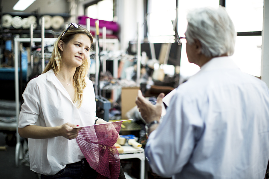 Kamila researches fabrics for the new collection, which will debut within the coming months. Working in the Garment District is always a pleasure. Here is one of the best fabric showrooms in the entire industry. Sometimes seeing a fabric means not falling asleep—that’s what happens with Kamila. (She was so excited by some of the textiles she saw that she hardly slept a wink!)